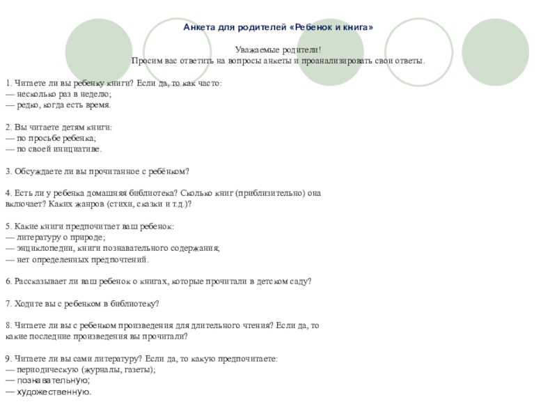 Слайд 7Анкета для родителей «Ребенок и книга»