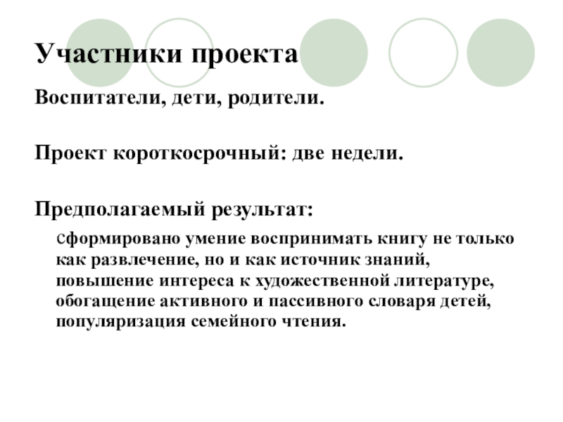 воспринимать книгу не только как развлечение, но и как источник знаний, повышение интереса к художественной литературе, обогащение активного и пассивного словаря детей, популяризация семейного чтения.