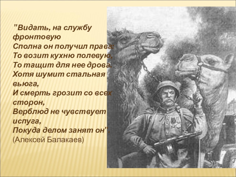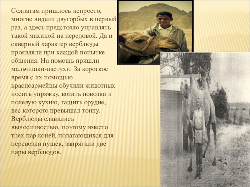 Слайд 4Солдатам пришлось непросто, многие видели двугорбых в первый раз, а здесь
