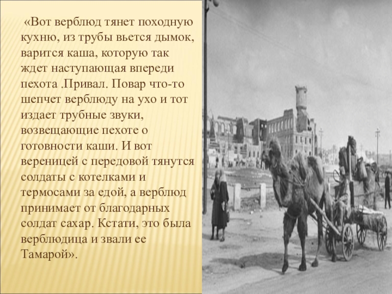 каша, которую так ждет наступающая впереди пехота .Привал. Повар что-то шепчет верблюду на ухо и тот издает трубные звуки, возвещающие пехоте о готовности каши. И вот вереницей с передовой тянутся солдаты с котелками и термосами за едой, а верблюд принимает от благодарных солдат сахар. Кстати, это была верблюдица и звали ее Тамарой».