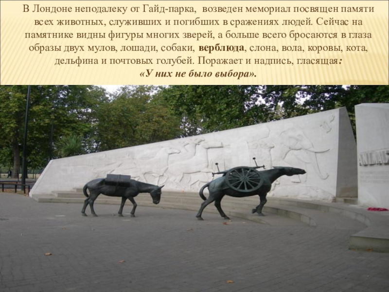 Слайд 14В Лондоне неподалеку от Гайд-парка, возведен мемориал посвящен памяти всех животных,