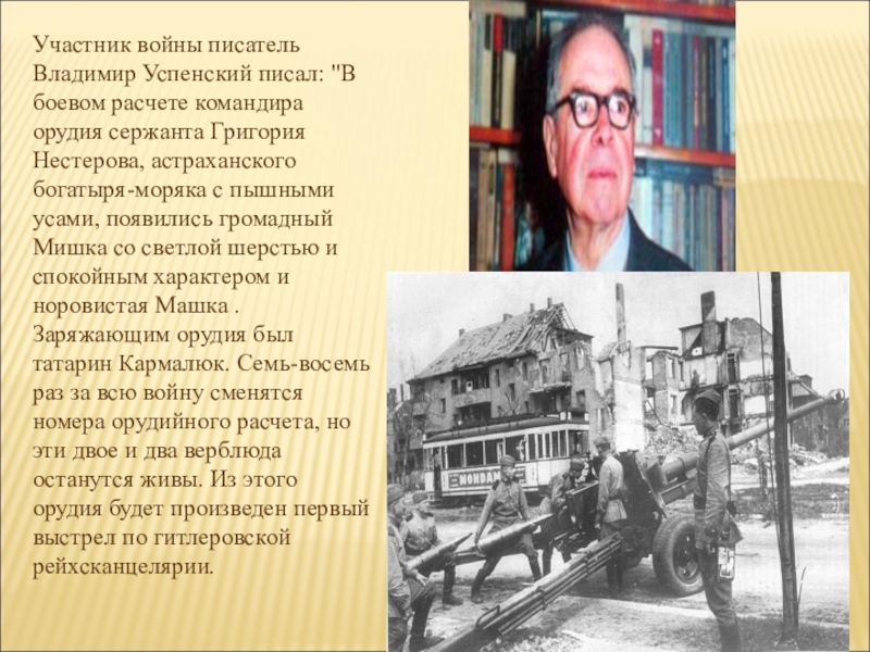 сержанта Григория Нестерова, астраханского богатыря-моряка с пышными усами, появились громадный Мишка со светлой шерстью и спокойным характером и норовистая Машка . Заряжающим орудия был татарин Кармалюк. Семь-восемь раз за всю войну сменятся номера орудийного расчета, но эти двое и два верблюда останутся живы. Из этого орудия будет произведен первый выстрел по гитлеровской рейхсканцелярии.