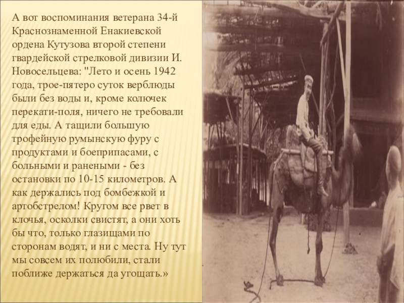 гвардейской стрелковой дивизии И. Новосельцева: "Лето и осень 1942 года, трое-пятеро суток верблюды были без воды и, кроме колючек перекати-поля, ничего не требовали для еды. А тащили большую трофейную румынскую фуру с продуктами и боеприпасами, с больными и ранеными - без остановки по 10-15 километров. А как держались под бомбежкой и артобстрелом! Кругом все рвет в клочья, осколки свистят, а они хоть бы что, только глазищами по сторонам водят, и ни с места. Ну тут мы совсем их полюбили, стали поближе держаться да угощать.»