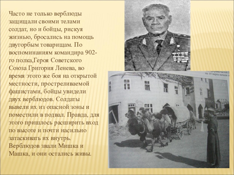 рискуя жизнью, бросались на помощь двугорбым товарищам. По воспоминаниям командира 902-го полка,Героя Советского Союза Григория Ленева, во время этого же боя на открытой местности, простреливаемой фашистами, бойцы увидели двух верблюдов. Солдаты вывели их из опасной зоны и поместили в подвал. Правда, для этого пришлось расширить вход по высоте и почти насильно затаскивать их внутрь. Верблюдов звали Мишка и Машка, и они остались живы.