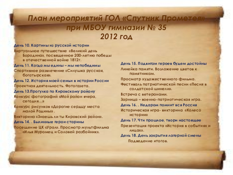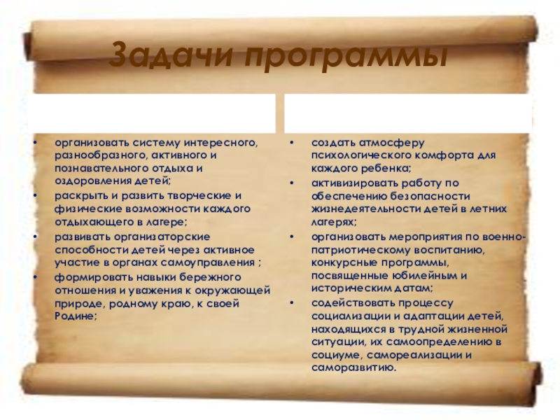 Данная программа предполагает организацию летнего оздоровительного пространства с учетом реализации индивидуального и группового подхода к реализации потребностей и запросов отдыхающих и создание необходимых условий личностного роста и развития ребенка. Программа предусматривает расширение и закрепление у детей знаний об истории России, освоение детьми новых пространств деятельности в соответствии с желаниями и способностям, освящает и предлагает новые перспективные направления досуга.