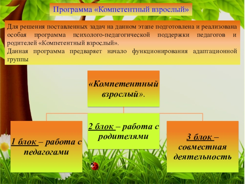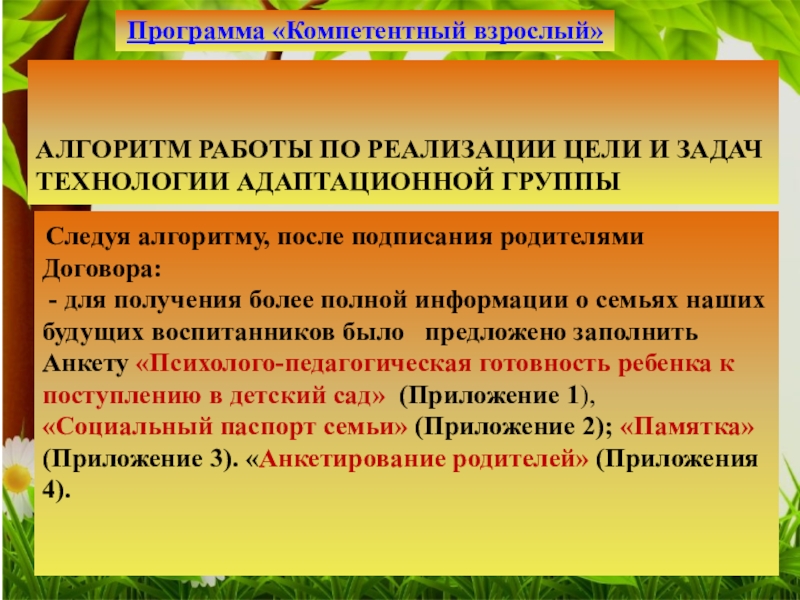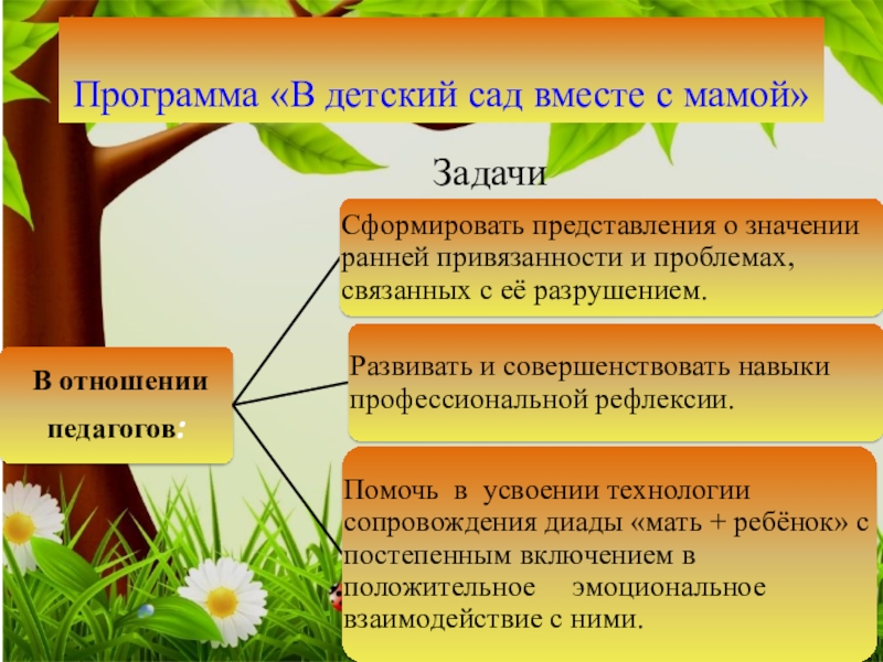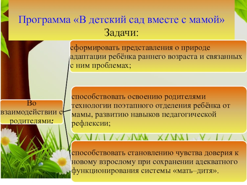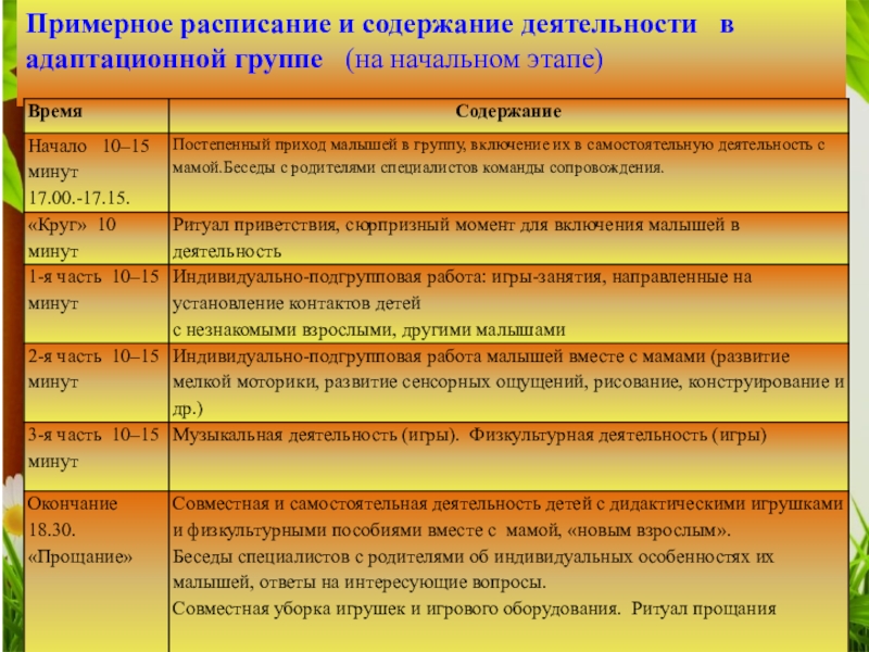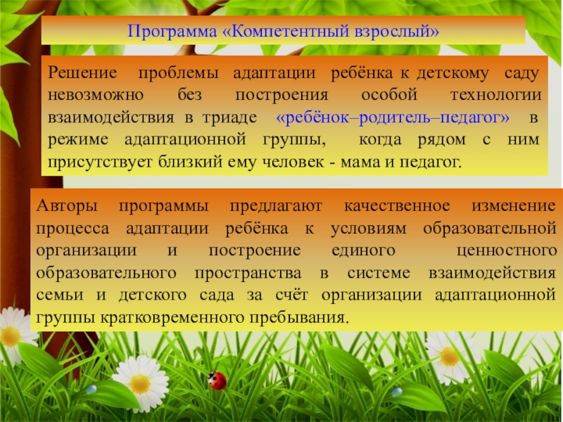 Авторы программы предлагают качественное изменение процесса адаптации ребёнка к условиям образовательной организации и построение единого ценностного образовательного пространства в системе взаимодействия семьи и детского сада за счёт организации адаптационной группы кратковременного пребывания.