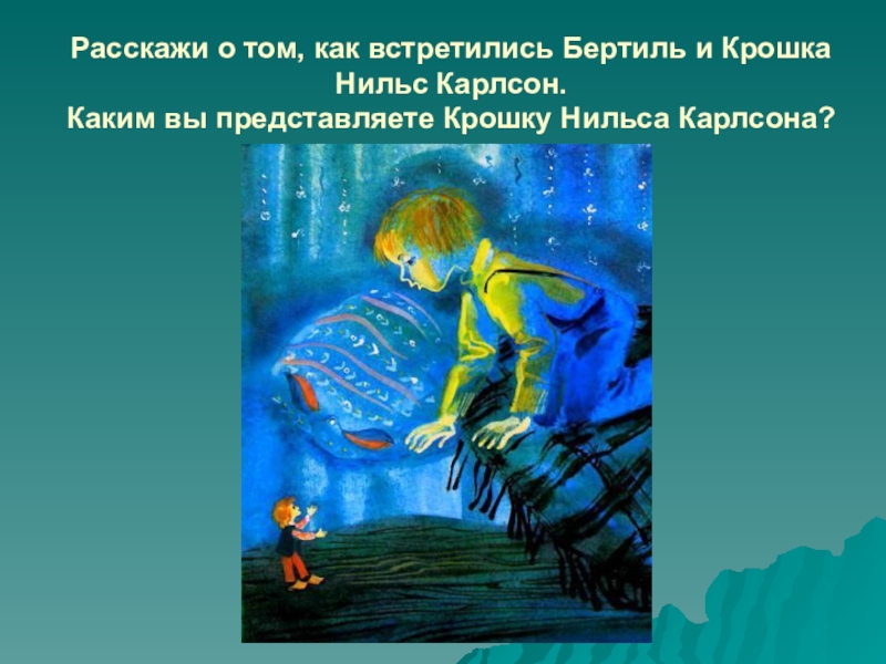 Слайд 4Расскажи о том, как встретились Бертиль и Крошка Нильс Карлсон. Каким вы