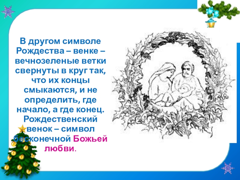 круг так, что их концы смыкаются, и не определить, где начало, а где конец. Рождественский венок – символ бесконечной Божьей любви.