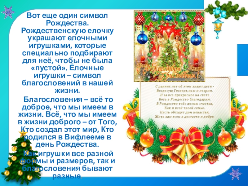 Слайд 6Вот еще один символ Рождества. Рождественскую елочку украшают елочными игрушками, которые