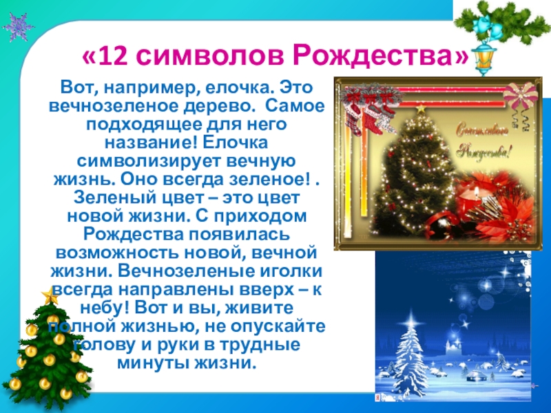для него название! Елочка символизирует вечную жизнь. Оно всегда зеленое! . Зеленый цвет – это цвет новой жизни. С приходом Рождества появилась возможность новой, вечной жизни. Вечнозеленые иголки всегда направлены вверх – к небу! Вот и вы, живите полной жизнью, не опускайте голову и руки в трудные минуты жизни.