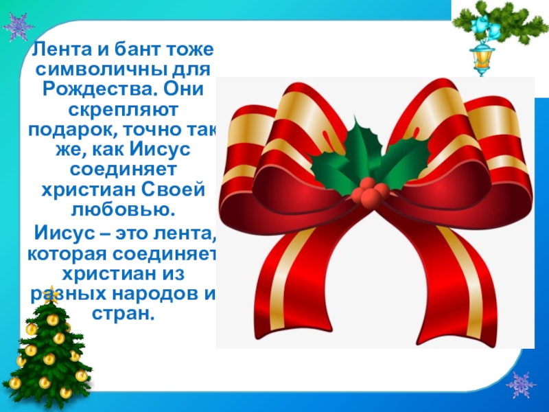 Слайд 9Лента и бант тоже символичны для Рождества. Они скрепляют подарок, точно