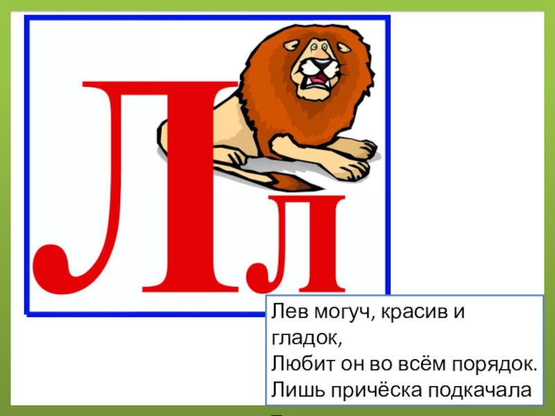 Слайд 11Лев могуч, красив и гладок, Любит он во всём порядок. Лишь причёска подкачала
