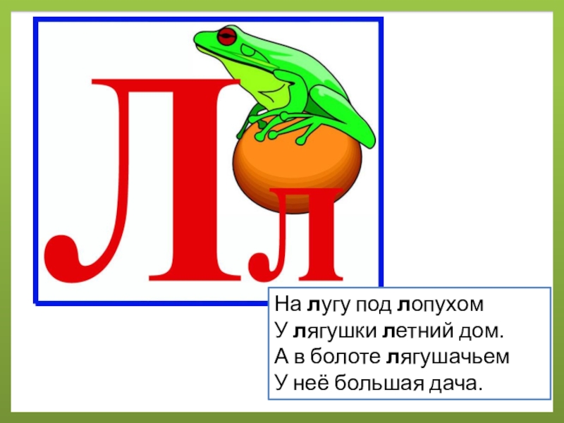 Слайд 12На лугу под лопухом У лягушки летний дом. А в болоте лягушачьем У неё большая дача.