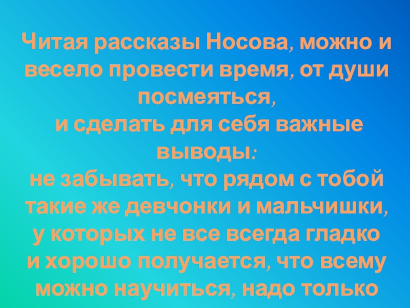 Читая рассказы Носова, можно и весело провести время, от души посмеяться, и сделать для себя важные выводы: