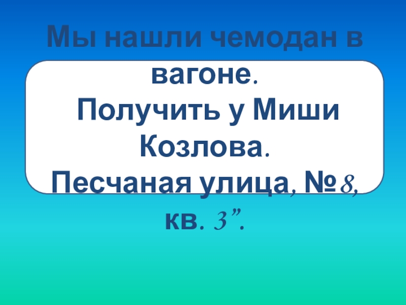 Мы нашли чемодан в вагоне. Получить у Миши Козлова. Песчаная улица, №8, кв. 3”.