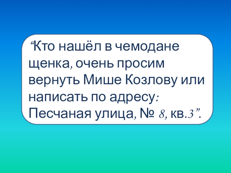 Слайд 29“Кто нашёл в чемодане щенка, очень просим вернуть Мише Козлову или