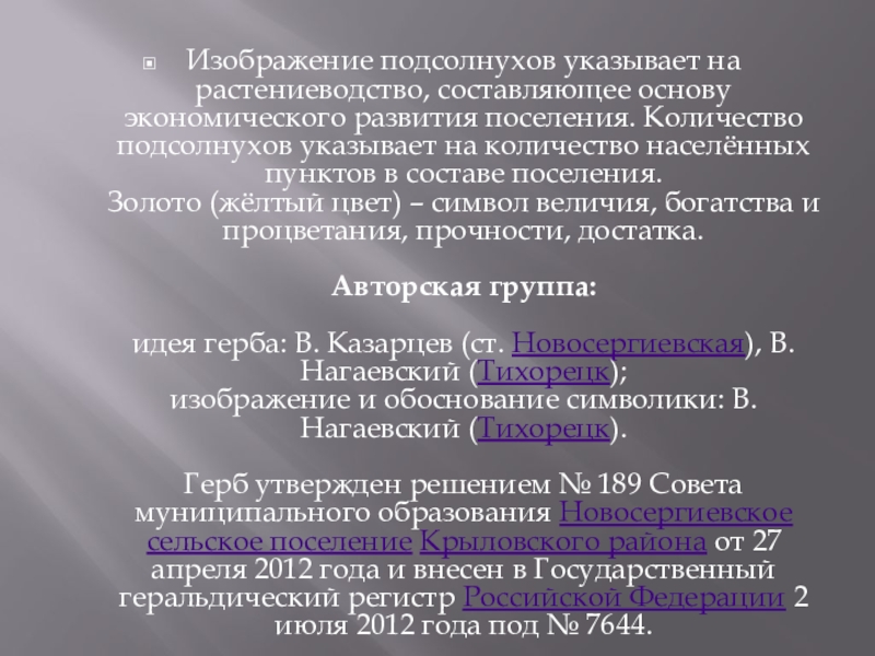 Слайд 15Изображение подсолнухов указывает на растениеводство, составляющее основу экономического развития поселения. Количество