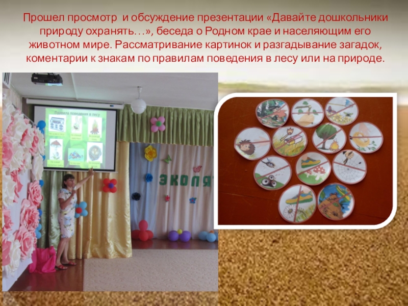 Слайд 4Прошел просмотр и обсуждение презентации «Давайте дошкольники природу охранять…», беседа о
