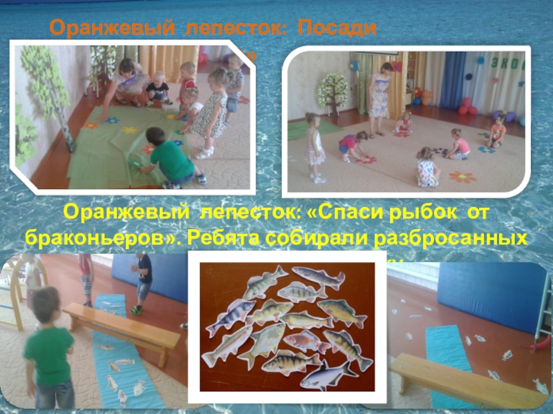 Оранжевый лепесток: Посади цветы»Оранжевый лепесток: «Спаси рыбок от браконьеров». Ребята собирали разбросанных рыбок и пускали в речку.