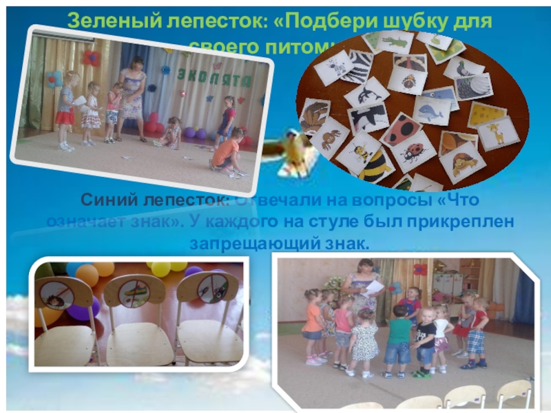 Зеленый лепесток: «Подбери шубку для своего питомца». Синий лепесток: Отвечали на вопросы «Что означает знак». У каждого