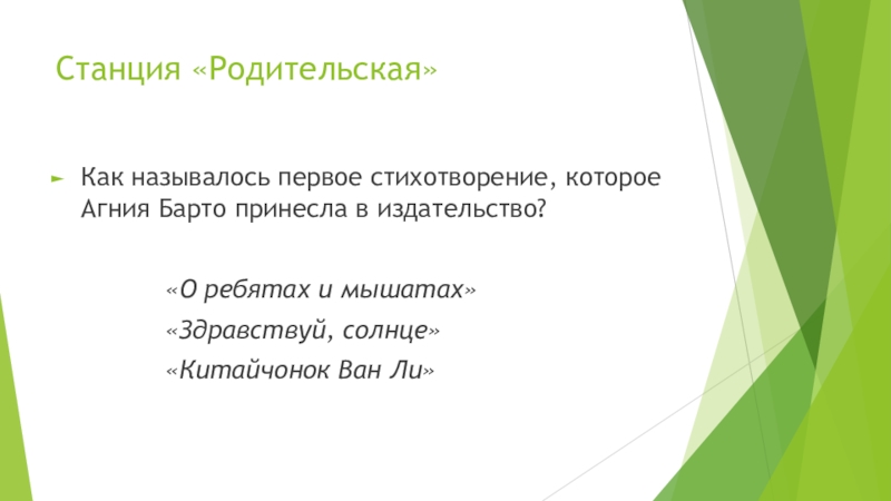 Станция «Родительская»Как называлось первое стихотворение, которое Агния Барто принесла в издательство?
