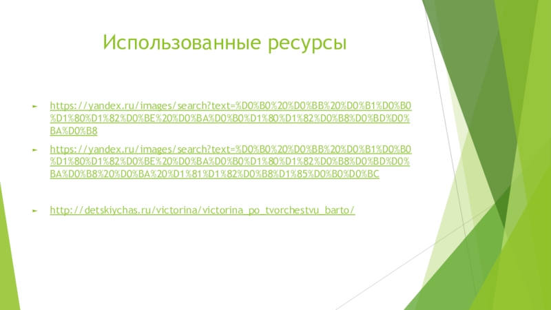 Использованные ресурсыhttps://yandex.ru/images/search?text=%D0%B0%20%D0%BB%20%D0%B1%D0%B0%D1%80%D1%82%D0%BE%20%D0%BA%D0%B0%D1%80%D1%82%D0%B8%D0%BD%D0%BA%D0%B8https://yandex.ru/images/search?text=%D0%B0%20%D0%BB%20%D0%B1%D0%B0%D1%80%D1%82%D0%BE%20%D0%BA%D0%B0%D1%80%D1%82%D0%B8%D0%BD%D0%BA%D0%B8%20%D0%BA%20%D1%81%D1%82%D0%B8%D1%85%D0%B0%D0%BChttp://detskiychas.ru/victorina/victorina_po_tvorchestvu_barto/