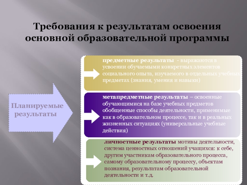 предметные результаты - выражаются в усвоении обучаемыми конкретных элементов социального опыта, изучаемого в отдельных учебных предметах (знания, умения и навыки)