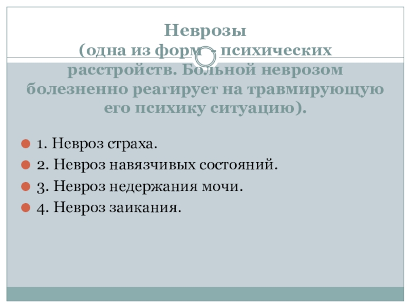 (одна из форм - психических расстройств. Больной неврозом болезненно реагирует