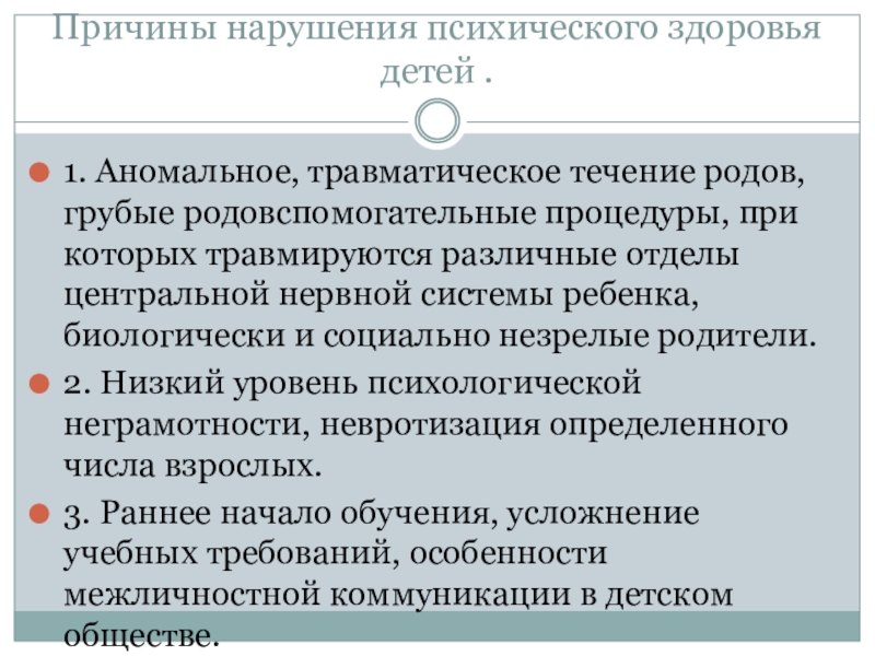 родовспомогательные процедуры, при которых травмируются различные отделы центральной нервной системы ребенка, биологически и социально незрелые родители.