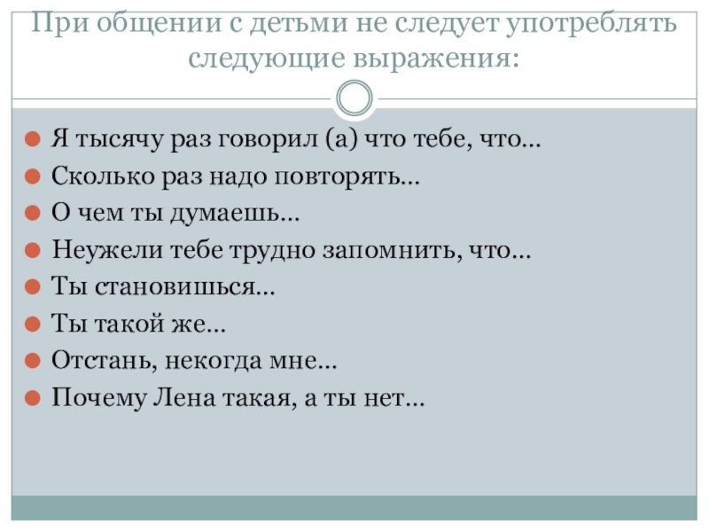 Слайд 7При общении с детьми не следует употреблять следующие выражения: