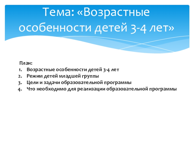 Слайд 5Тема: «Возрастные особенности детей 3-4 лет»