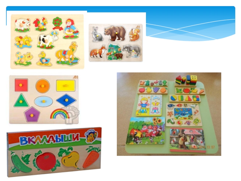 -Различные деревянные пазлы- вкладыши (одежда, обувь, животные, фрукты, геометрические фигуры, профессии)