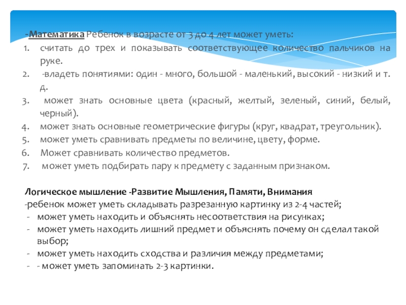 Слайд 7-Математика Ребенок в возрасте от 3 до 4 лет может уметь: