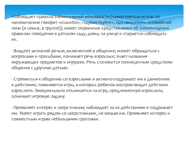 Слайд 12-Соблюдает правила элементарной вежливости (самостоятельно или по напоминанию говорит «спасибо», «здравствуйте»,