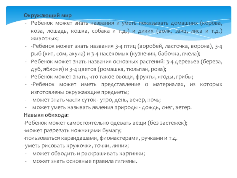 - Использует специфические, культурно фиксированные предметные действия, знает назначение бытовых предметов ( ложки, расчески, карандаша и пр.) и умеет пользоваться ими. Владеет простейшими навыками самообслуживания; стремится проявлять самостоятельность в бытовом и игровом поведении; проявляет навыки опрятности.