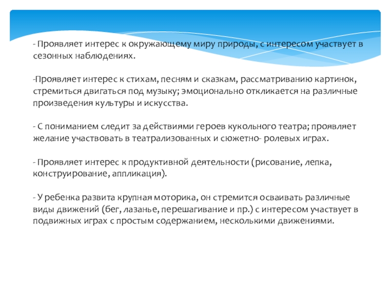 Слайд 13- Проявляет интерес к окружающему миру природы, с интересом участвует в