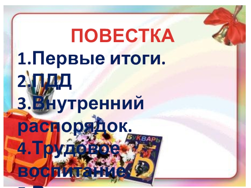 ПОВЕСТКА1.Первые итоги.2.ПДД3.Внутренний распорядок.4.Трудовое воспитание.5.Внеурочная занятость.