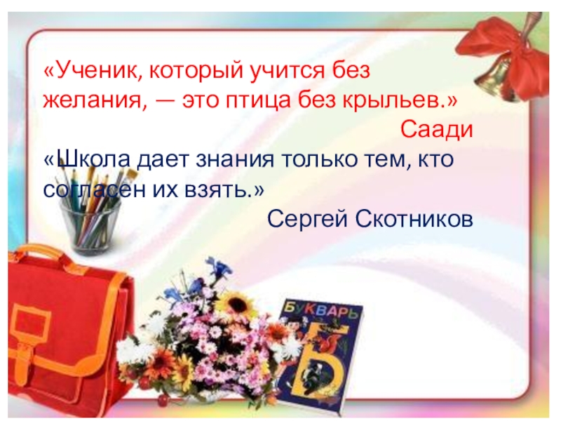 «Ученик, который учится без желания, — это птица без крыльев.»Саади«Школа дает знания только тем, кто согласен их