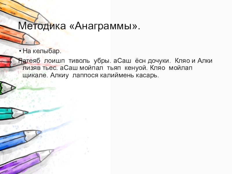 Методика «Анаграммы».На келыбар.Ратеяб лоишп тиволь убры. аСаш ёсн дочуки. Кляо и Алки лизяв тьес. аСаш мойпал тьяп