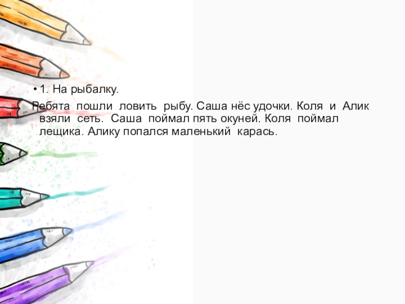 1. На рыбалку.Ребята пошли ловить рыбу. Саша нёс удочки. Коля и Алик взяли сеть. Саша поймал пять