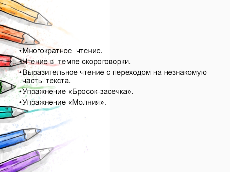 Многократное чтение.Чтение в темпе скороговорки.Выразительное чтение с переходом на незнакомую часть текста.Упражнение «Бросок-засечка».Упражнение «Молния».