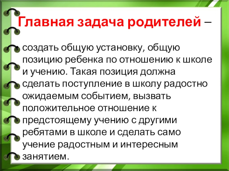 отношению к школе и учению. Такая позиция должна сделать поступление в школу радостно ожидаемым событием, вызвать положительное отношение к предстоящему учению с другими ребятами в школе и сделать само учение радостным и интересным занятием.