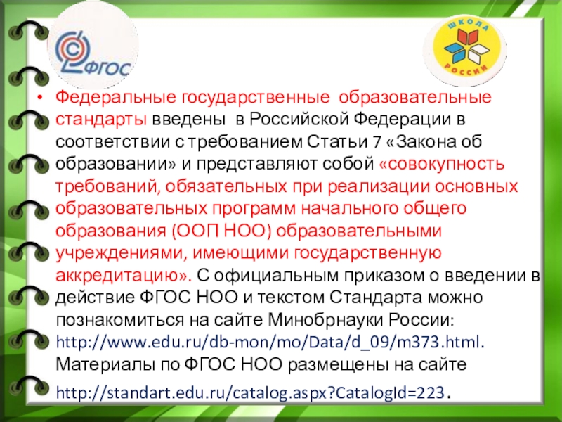 требованием Статьи 7 «Закона об образовании» и представляют собой «совокупность требований, обязательных при реализации основных образовательных программ начального общего образования (ООП НОО) образовательными учреждениями, имеющими государственную аккредитацию». С официальным приказом о введении в действие ФГОС НОО и текстом Стандарта можно познакомиться на сайте Минобрнауки России: http://www.edu.ru/db-mon/mo/Data/d_09/m373.html. Материалы по ФГОС НОО размещены на сайте http://standart.edu.ru/catalog.aspx?CatalogId=223.