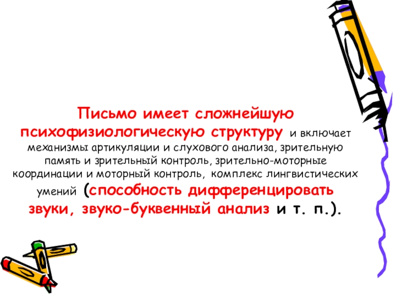Слайд 3Письмо имеет сложнейшую психофизиологическую структуру и включает механизмы артикуляции и слухового
