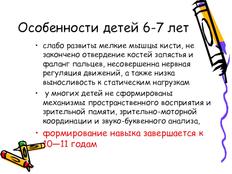 костей запястья и фаланг пальцев, несовершенна нервная регуляция движений, а также низка выносливость к статическим нагрузкам