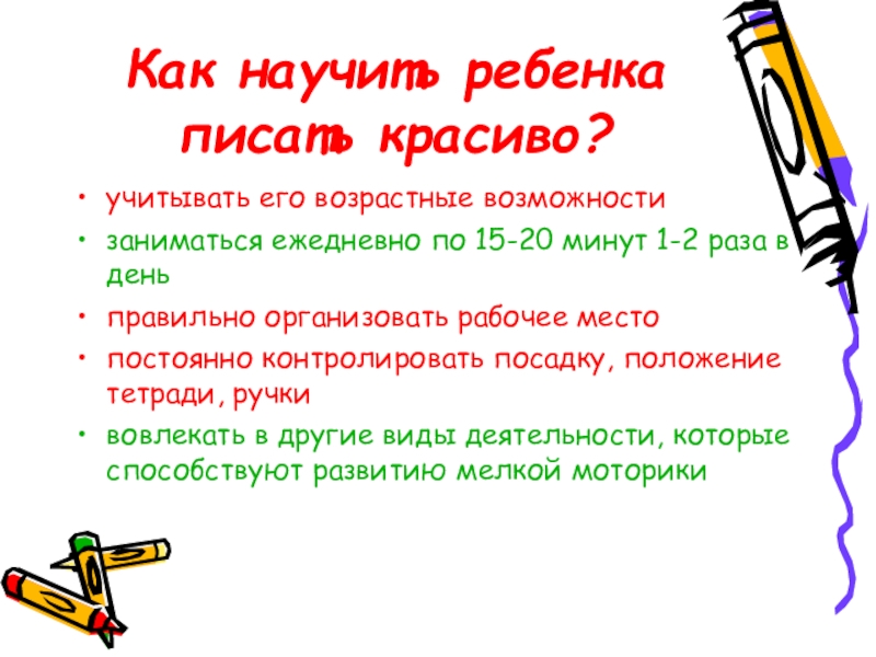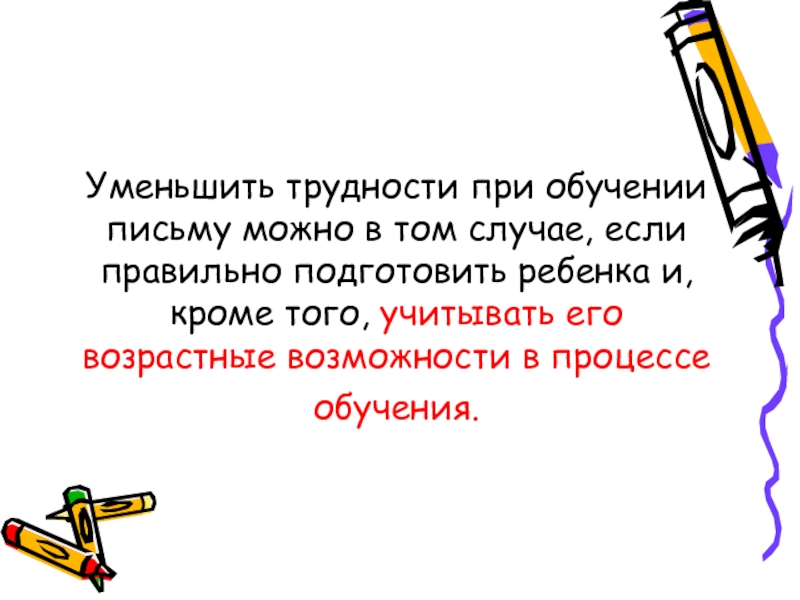 Слайд 6Уменьшить трудности при обучении письму можно в том случае, если правильно