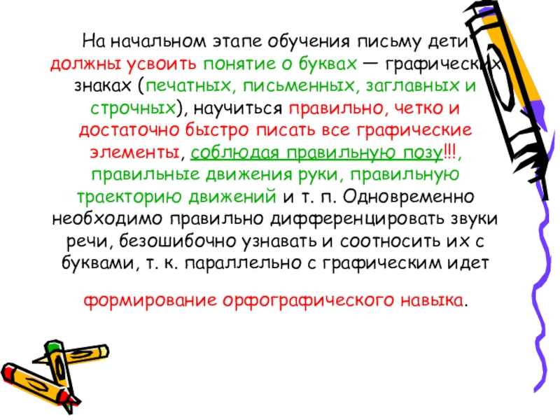 — графических знаках (печатных, письменных, заглавных и строчных), научиться правильно, четко и достаточно быстро писать все графические элементы, соблюдая правильную позу!!!, правильные движения руки, правильную траекторию движений и т. п. Одновременно необходимо правильно дифференцировать звуки речи, безошибочно узнавать и соотносить их с буквами, т. к. параллельно с графическим идет формирование орфографического навыка.