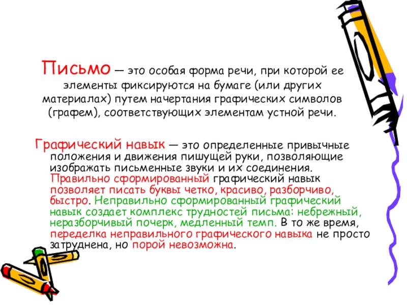 Графический навык — это определенные привычные положения и движения пишущей руки, позволяющие изображать письменные звуки и их соединения. Правильно сформированный графический навык позволяет писать буквы четко, красиво, разборчиво, быстро. Неправильно сформированный графический навык создает комплекс трудностей письма: небрежный, неразборчивый почерк, медленный темп. В то же время, переделка неправильного графического навыка не просто затруднена, но порой невозможна.