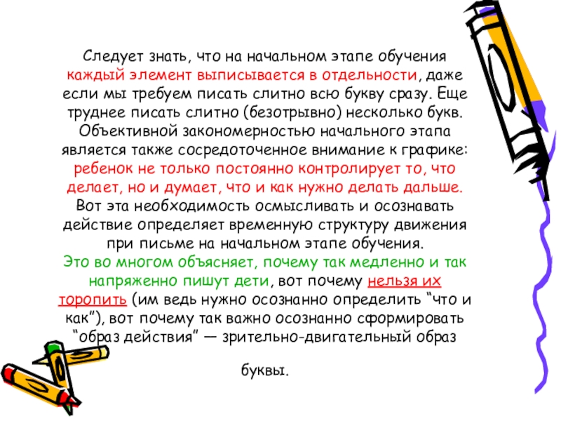 Это во многом объясняет, почему так медленно и так напряженно пишут дети, вот почему нельзя их торопить (им ведь нужно осознанно определить “что и как”), вот почему так важно осознанно сформировать “образ действия” — зрительно-двигательный образ буквы.