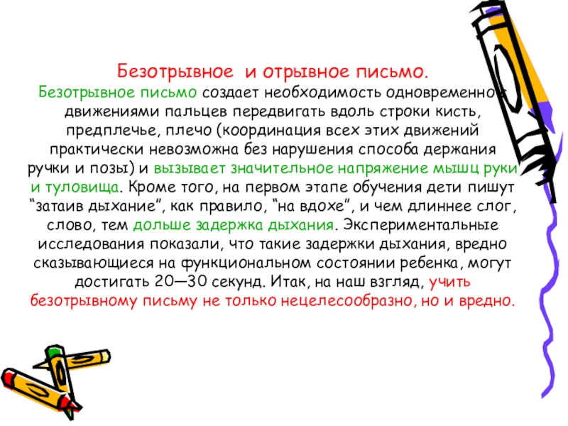 передвигать вдоль строки кисть, предплечье, плечо (координация всех этих движений практически невозможна без нарушения способа держания ручки и позы) и вызывает значительное напряжение мышц руки и туловища. Кроме того, на первом этапе обучения дети пишут “затаив дыхание”, как правило, “на вдохе”, и чем длиннее слог, слово, тем дольше задержка дыхания. Экспериментальные исследования показали, что такие задержки дыхания, вредно сказывающиеся на функциональном состоянии ребенка, могут достигать 20—30 секунд. Итак, на наш взгляд, учить безотрывному письму не только нецелесообразно, но и вредно.